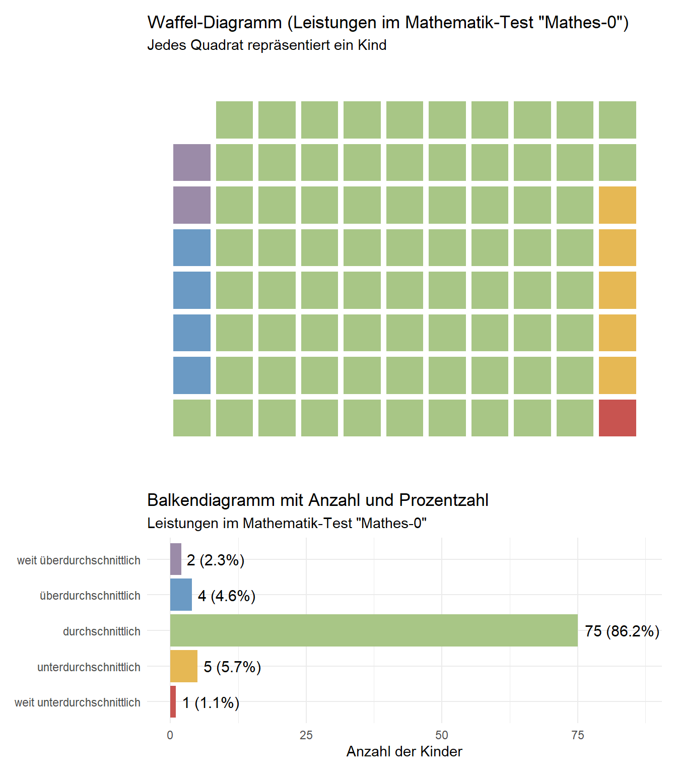 Bilder sagen bekanntlich mehr als Tabellen und tausend Worte. Wir entscheiden uns daher für eine grafische Darstellung der einzuschulenden Kinder. Mit dem Waffel-Diagramm wird jedes einzelne Kind als kleines Quadrat repräsentiert. Das dazugehörige Balkendiagramm zeigt uns die Anzahl und Prozentzahlen. Mit dieser Visualisierung verschaffen wir uns eine erste Übersicht über die Mathematik-Leistung der einzuschulenden Kinder.